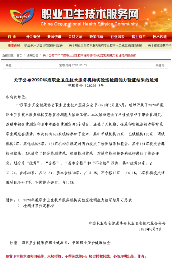 近日,根據(jù)關于公布《2020年度職業(yè)衛(wèi)生技術服務機構實驗室檢測能力驗證結果》(中職技分〔2020〕8號)的通知,沃特檢驗集團分公司佛山市沃特測試技術服務有限公司參加中國職業(yè)安全健康協(xié)會職業(yè)衛(wèi)生技術服務分會組織的2020年度職業(yè)衛(wèi)生技術服務機構實驗室檢測能力驗證,取得了“優(yōu)秀”綜合評定。