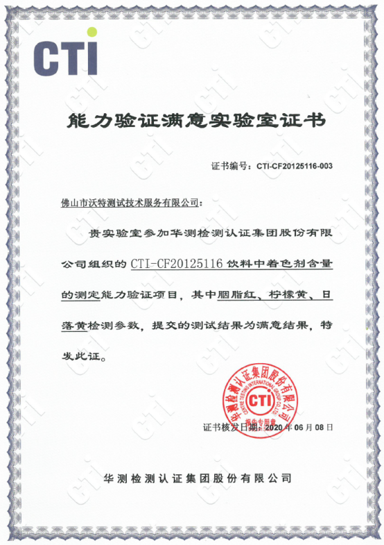 CTI-CF20125116飲料中著色劑含量的測(cè)定能力驗(yàn)證 結(jié)果滿意