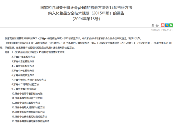 2024年3月21日,國家藥監局發布了《牙育pH值的檢驗方法》等15項檢驗方法,作為新增的牙育檢驗方法,納入《化妝品安全技術規范(2015年版)》。自2024年12月1日起,牙膏的注冊、備案及抽樣等應采用新的檢驗方法。