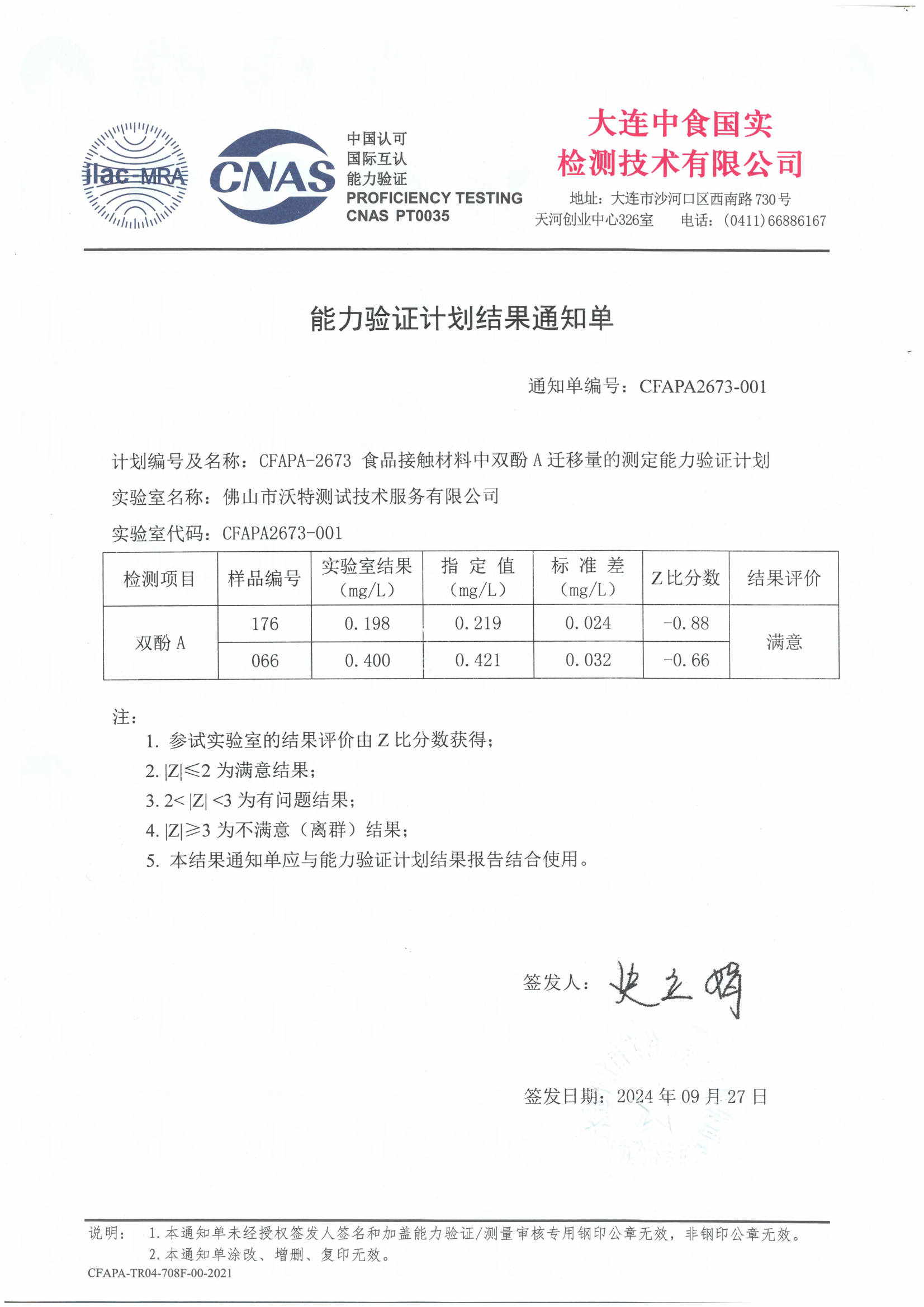 近日,佛山市沃特測(cè)試技術(shù)服務(wù)有限公司(以下簡稱“佛山沃特”)參加大連中食國實(shí)檢測(cè)技術(shù)有限公司組織的CFAPA-2673食品接觸材料中雙酚A遷移量的測(cè)定能力驗(yàn)證計(jì)劃,其中雙酚A檢測(cè)參數(shù),結(jié)果評(píng)價(jià)為滿意。