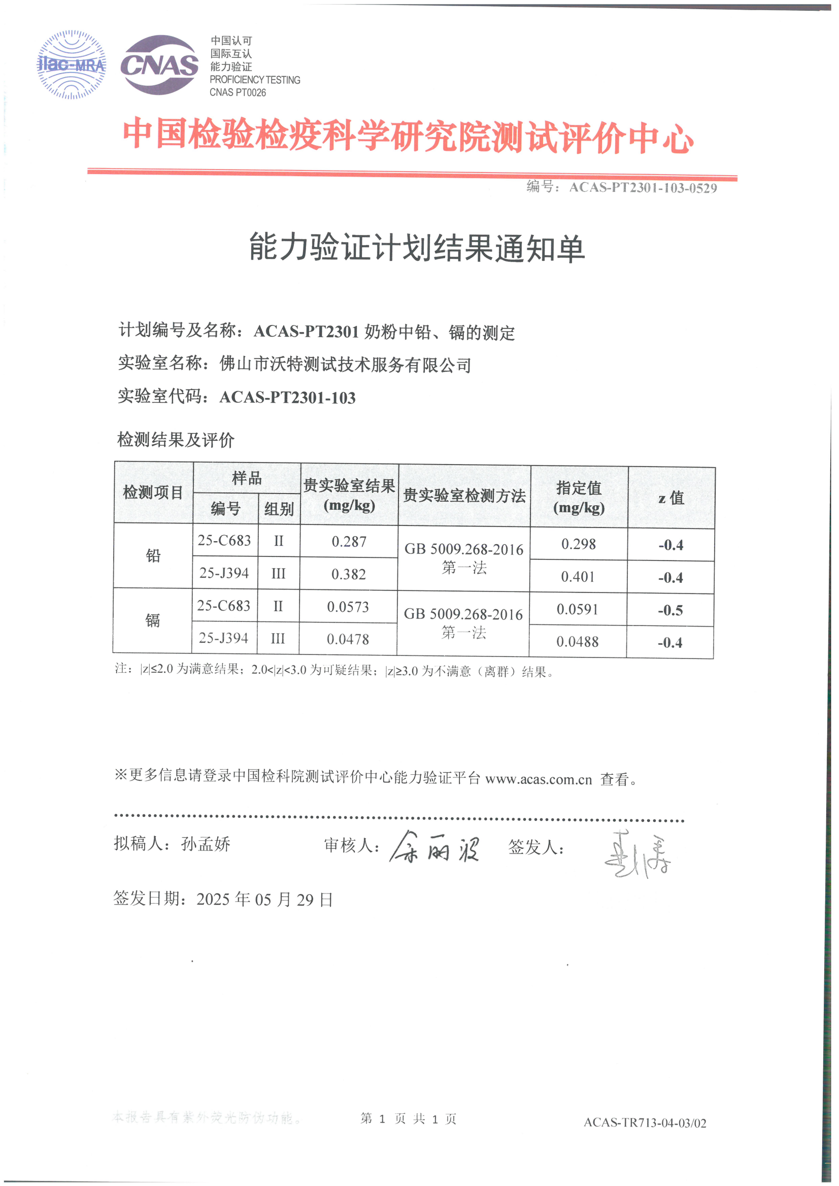 佛山沃特參加ACAS-PT2301奶粉中鉛、鎘的測定能力驗證 獲“滿意”結(jié)果