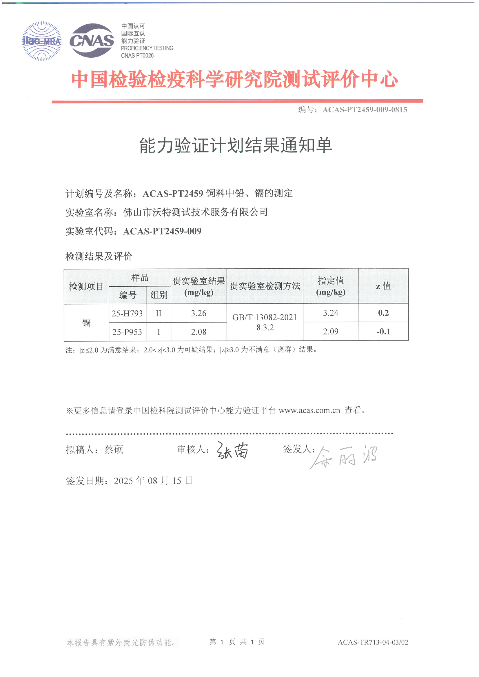 近日,佛山市沃特測(cè)試技術(shù)服務(wù)有限公司(以下簡(jiǎn)稱(chēng)“佛山沃特”)參加中國(guó)檢驗(yàn)檢疫科學(xué)研究院測(cè)試評(píng)價(jià)中心組織的ACAS-PT2459飼料中鉛、鎘的測(cè)定能力驗(yàn)證計(jì)劃,其中鎘檢測(cè)項(xiàng)目,結(jié)果評(píng)價(jià)為滿意。