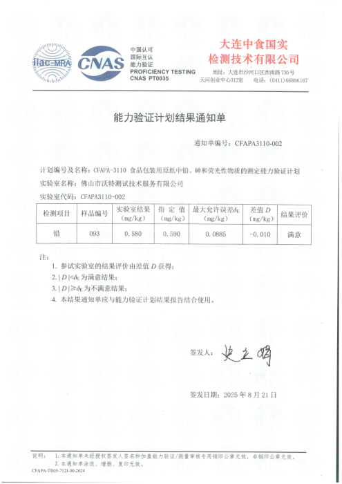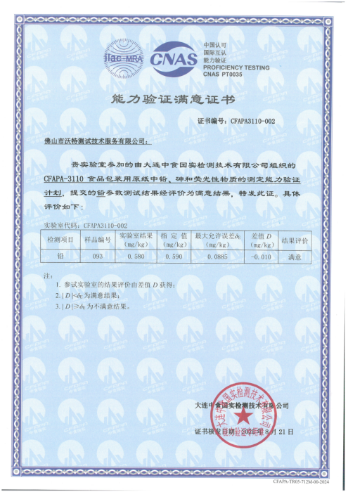近日,佛山市沃特測試技術(shù)服務(wù)有限公司(以下簡稱“佛山沃特”)參加大連中食國實檢測技術(shù)有限公司組織的CFAPA-3110食品包裝用原紙中鉛、砷和熒光性物質(zhì)的測定能力驗證計劃,其中鉛檢測項目,結(jié)果評價為滿意。