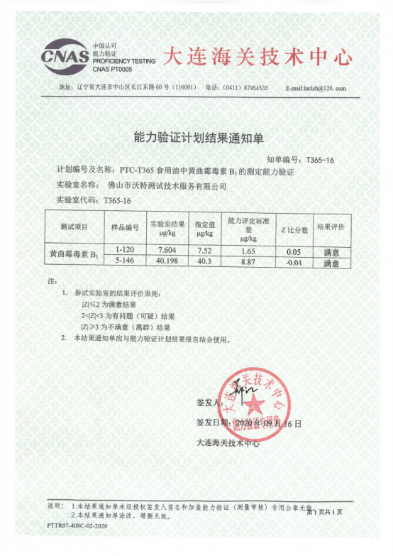 近日,沃特檢驗(yàn)集團(tuán)佛山分公司參加大連海關(guān)技術(shù)中心組織的參加PTC-T365食用油中黃曲霉毒素B1的測(cè)定能力驗(yàn)證獲得滿意結(jié)果。