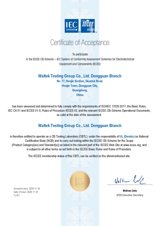 近日,深圳沃特檢驗集團有限公司東莞分公司(以下簡稱“沃特東莞”)獲得由IECEE頒發(fā)的CB Testing Laboratory(以下簡稱“CBTL”)授權證書。